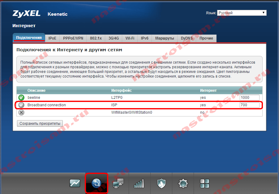 Шаг 2. В Веб-интерфейсе роутера выбираем в нижнем меню значок Интернет в виде глобуса: