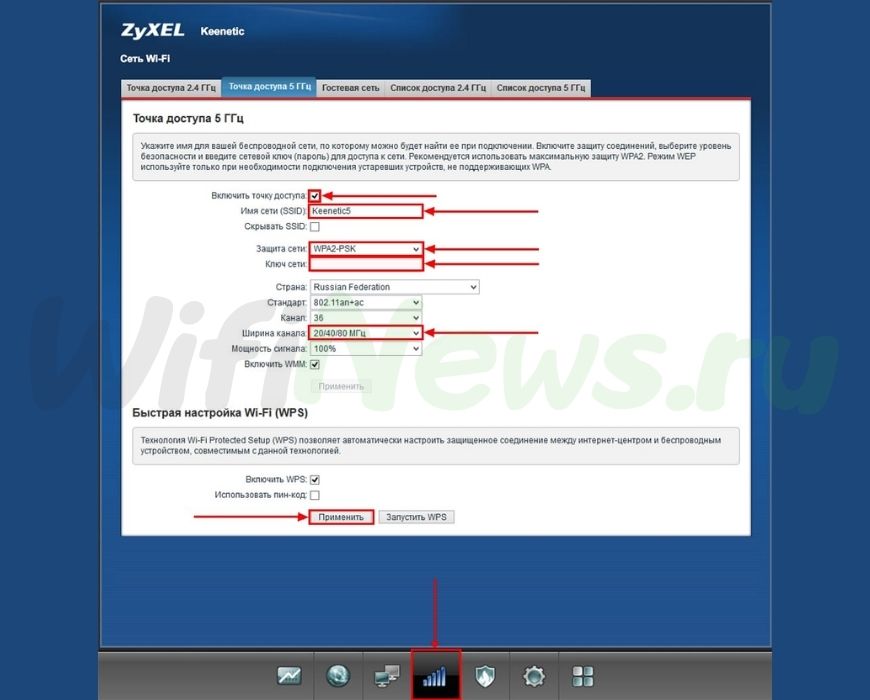 - Устанавливаем галочку напротив Включить точку доступа», далее в поле Имя сети (SSID)» прописываем и указываем имя беспроводной сети, в нашем случае «KEENETIC5», добавляем частоту сети 5 Ггц чтобы отличать от сети 2,4Ггц.