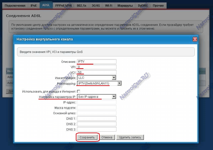 Откроется окно создания PVC-канала. В поле Описание вводим название — IPTV. В поля VPI и VCI нужно ввести параметры канала для IPTV, которые перед этим нужно узнать в техподдержке провайдера. Инкапсуляцию оставляем LLC.