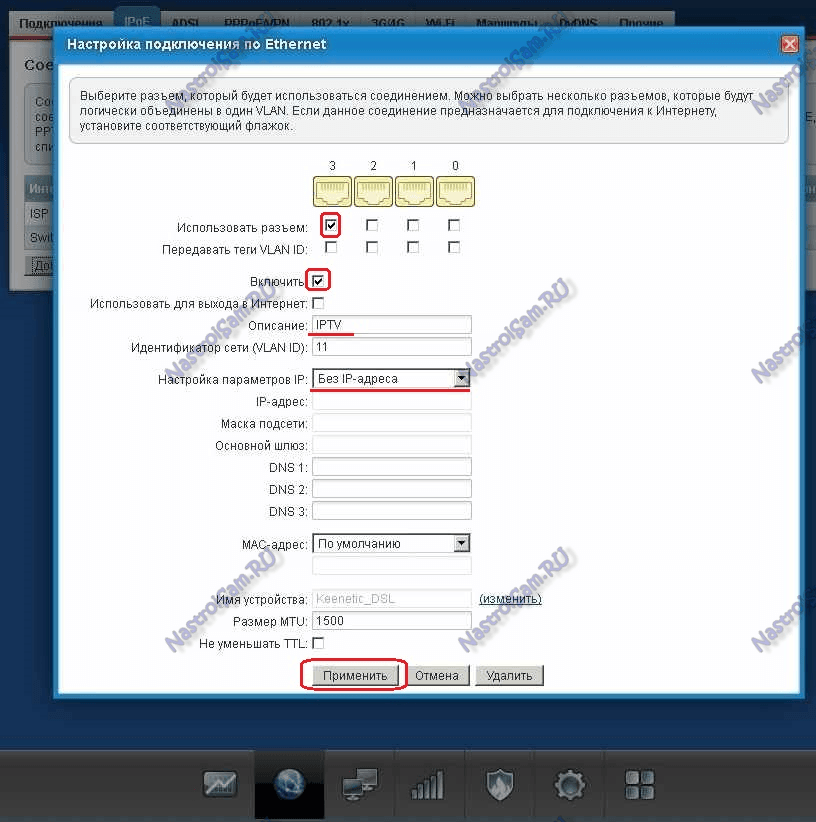 Ставим галочку «Использовать разъем» рядом с тем портом маршрутизатора, в который будет включена ТВ-приставка. Как правило для этого используется 4-й LAN-порт. Так как LAN-порты в веб-интерфейсе нумеруются с нуля, галку ставим под портом 3.