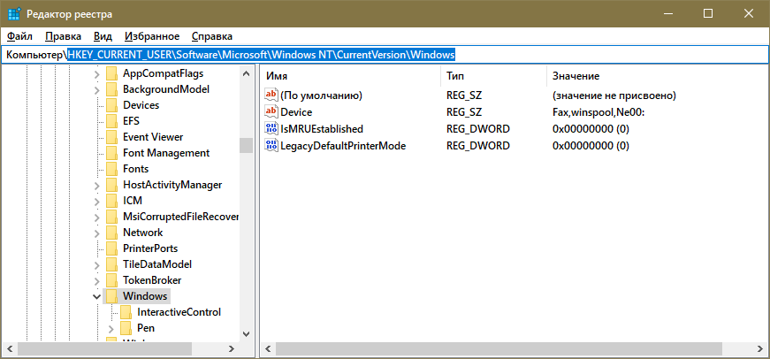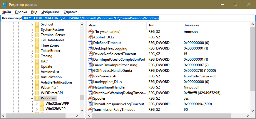- Переместитесь в директорию HKEY_LOCAL_MACHINESOFTWAREMicrosoftWindowsNTCurrentVersionWindows и откройте ключ AppInit_DLLs.