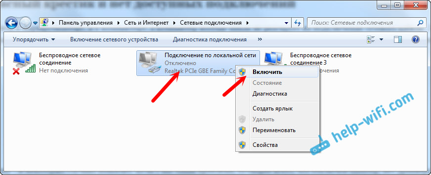 На Windows 10 в этом случае на значке сетевой карты будет кружок со стрелочкой, а на более старых версия — красный крестик. Чтобы её включить снова — кликаем правой кнопкой и выбираем пункт меню «Задействовать».