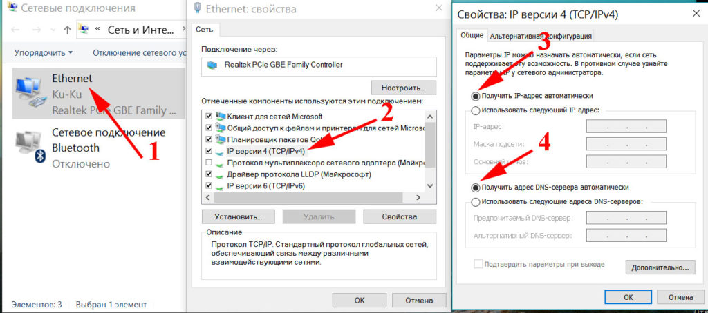 - На рабочем сетевом подключении, жмем правой клавишей мыши и делаем выбор «Свойства», потом «IP версия 4 (TCP/IPv4». В окне, которое выскочит, ставим точки напротив строки «Получить IP-адрес автоматически» и «Получить адрес DNS-сервера автоматически». Готово. Таким же способом вы сможете ввести и статический айпи адрес.