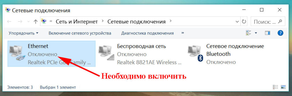 В новом окне вы должны увидеть адаптер «Подключение по локальной сети», или «Ethernet» (в Windiws 10). Это и есть сетевая карта. Если он в статусе «Отключено», то нажмите на него правой кнопкой мыши, и выберите «Включить».