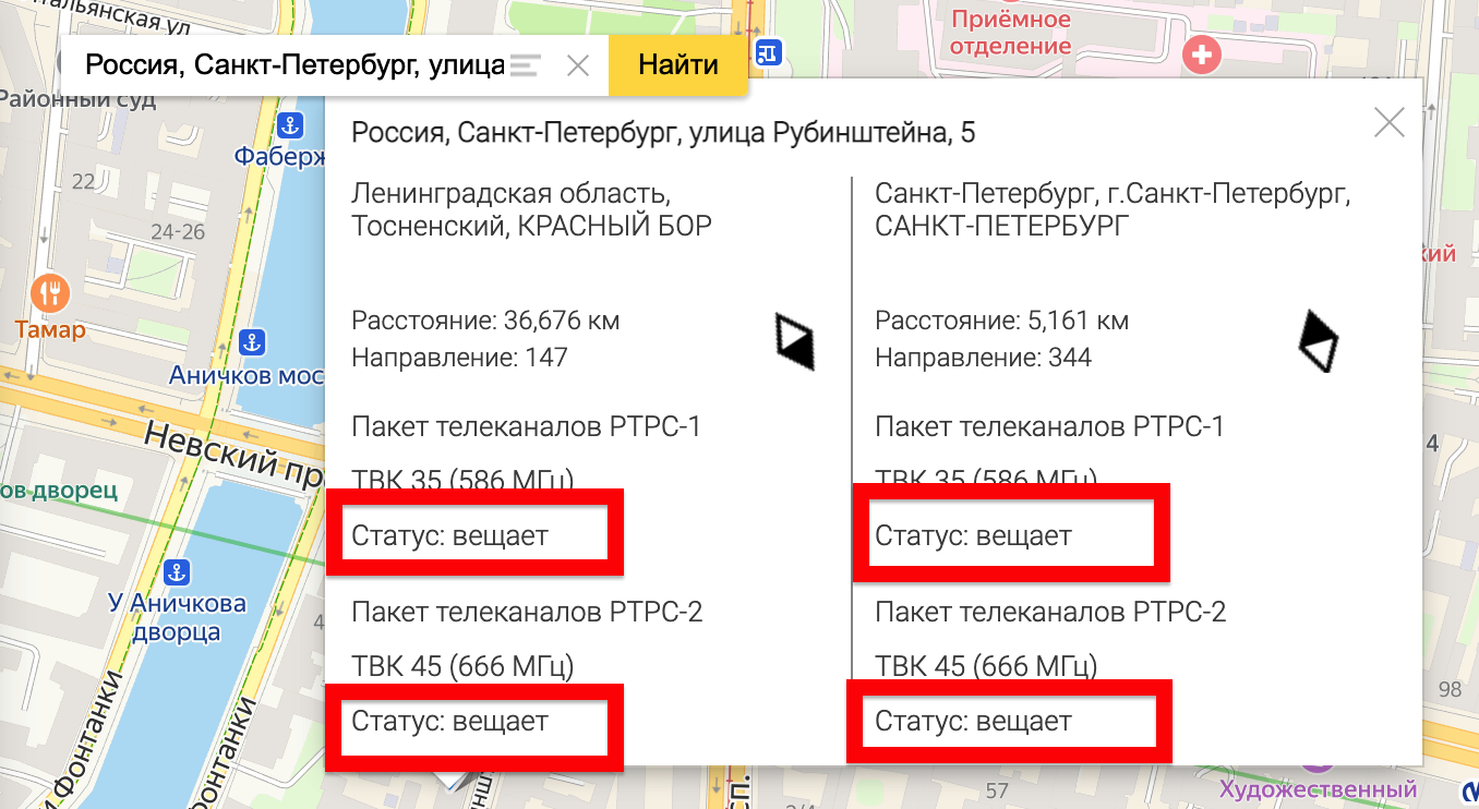 Точно так же вы можете обратиться в службу картографии RTRS. Найдите свой дом или ближайший дом на карте. Нажмите на дом и в информационном окне ретранслятора убедитесь, что статус «Трансляция» находится напротив каждого мультиплекса.