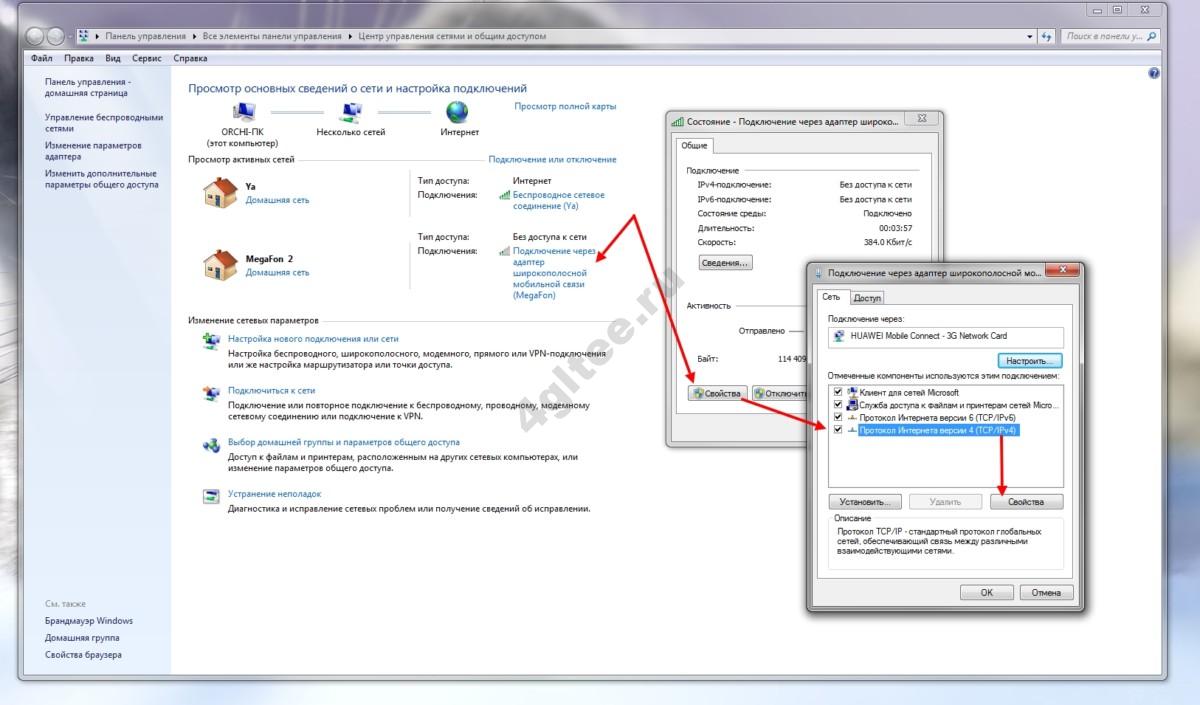 дважды кликните «Подключение через адаптер мобильного интернета (МегаФон)» → «Свойства»;
