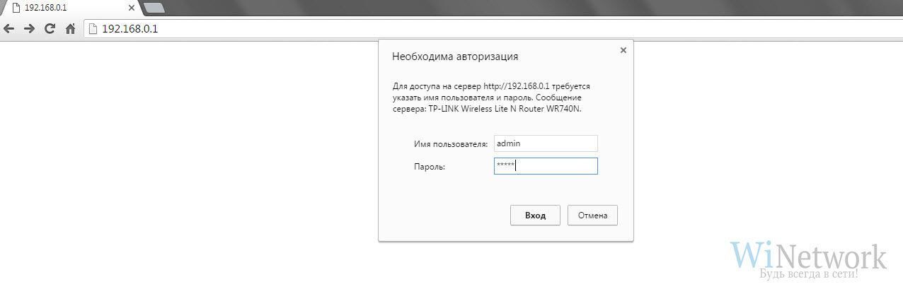 4. Открываем ваш любимый браузер и пишем там где адресная строка — 192.168.0.1 (или тот другой, который указан на роутере), и залогиниваемся.