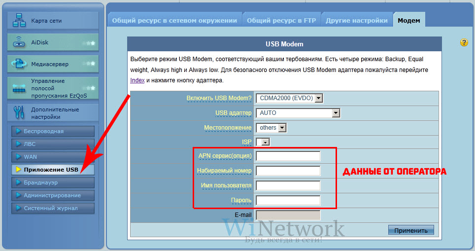 5. Смотрим на меню роутера и находим пункт «USB модем» ( или может быть 3G/4G или настройка USB и т.п. варианты), активируем его и вводим в указанные на изображении поля данные для вашего оператора.