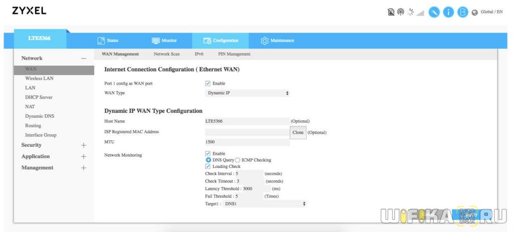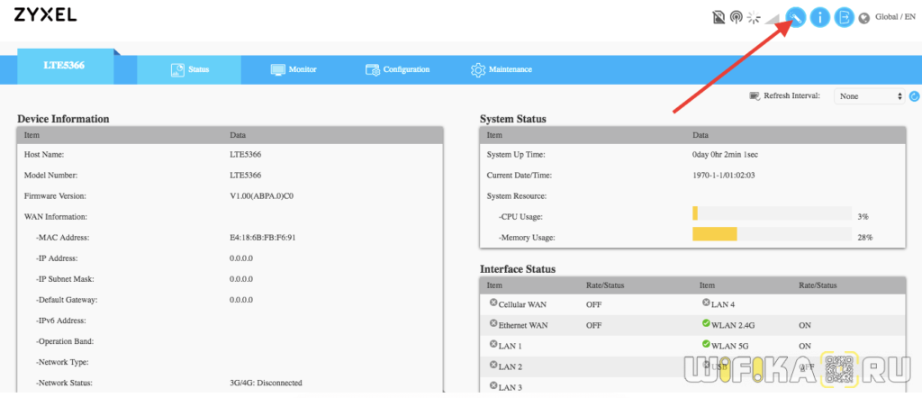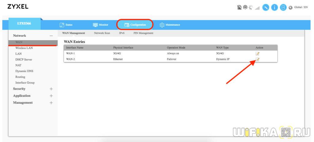 После перезапуска нужно заново подключиться к созданным новым сетям и повторно войти в админку. Для настройки резервного интернета через кабельное подключение, открываем в меню «Configuration» раздел «WAN». И жмем на иконку редактирования напротив строки «WAN2»