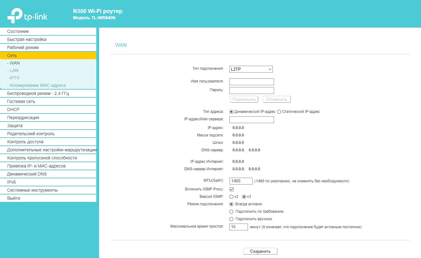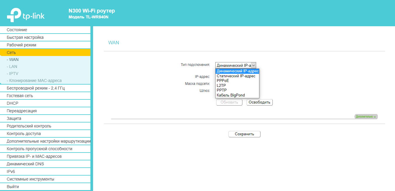 - В меню выбрать «Сеть» (Network), а после категорию WAN Connection type: L2TP или PPTP.