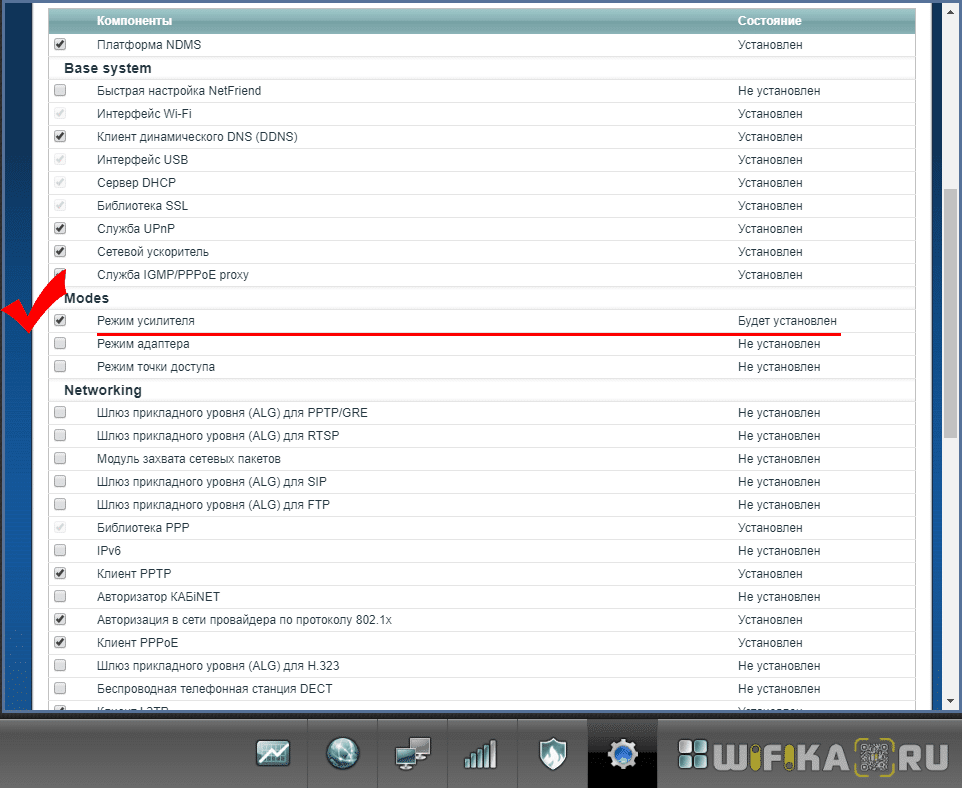 И видим как раз те самые модули — часть из них активна, а часть — не установлена. Здесь прокручиваем список вниз до значения «Режим усилителя» и ставим на нем «галочку» — в правой колонке появится надпись «Будет установлен».