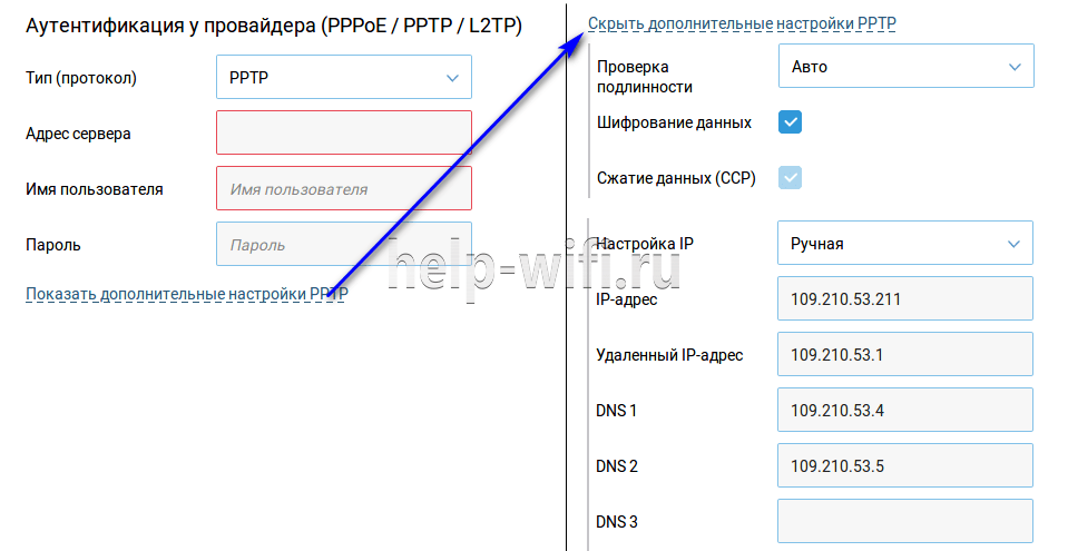 PPTP, L2TP – указать адрес или доменное имя сервера, логин и пароль; нажать «Дополнительные настройки», выбрать автоматическую или ручную настройку IP (во втором случае указать IP-адрес и адрес шлюза).