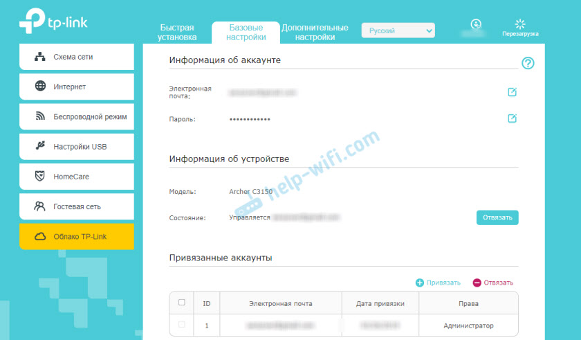 Вводим адрес электронной почты и пароль, который был указан при регистрации аккаунта на сайте TP-LINK Cloud и получаем полный доступ к веб-интерфейсу маршрутизатора.