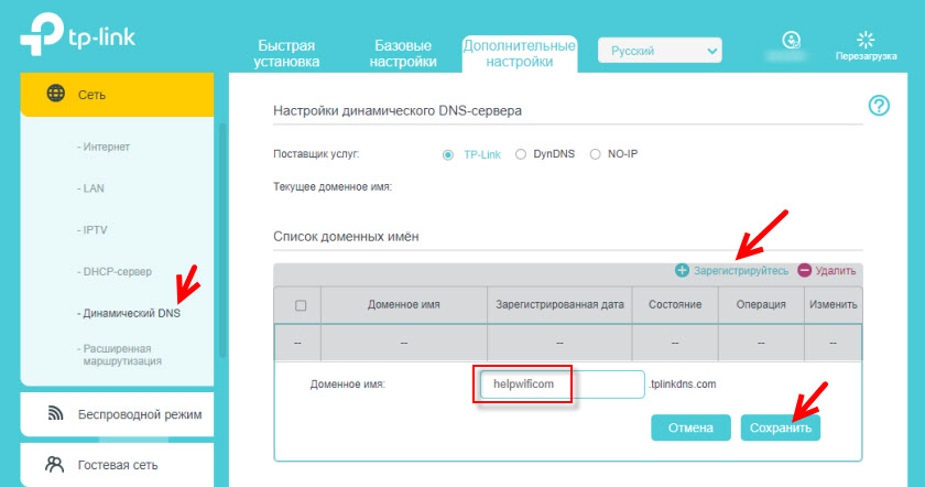 Дальше нужно перейти в раздел «Дополнительные настройки» — «Сеть» — «Динамический DNS» и зарегистрировать для роутера постоянный адрес в сервисе TP-Link DNS.