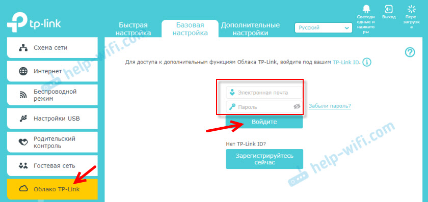 Для начала нужно открыть настройки маршрутизатор и перейти в раздел «Базовые настройки» – «Облако TP-Link». Там нужно перейти на сайт tplinkcloud.com (нажать на кнопку «Зарегистрируйтесь сейчас») и зарегистрировать себе аккаунт. Обязательно сохраните почту и пароль, который вы укажите при регистрации.