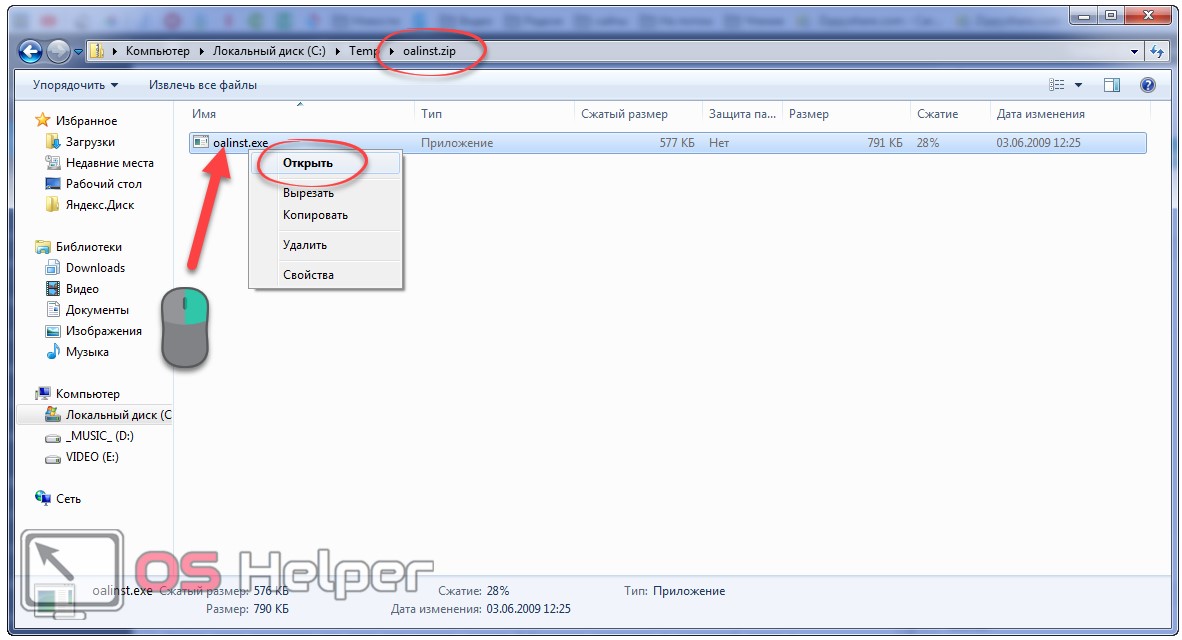 - Выполняем двойной клик по архиву «oalinst.zip» и запускаем расположенный в нём «oalinst.exe».