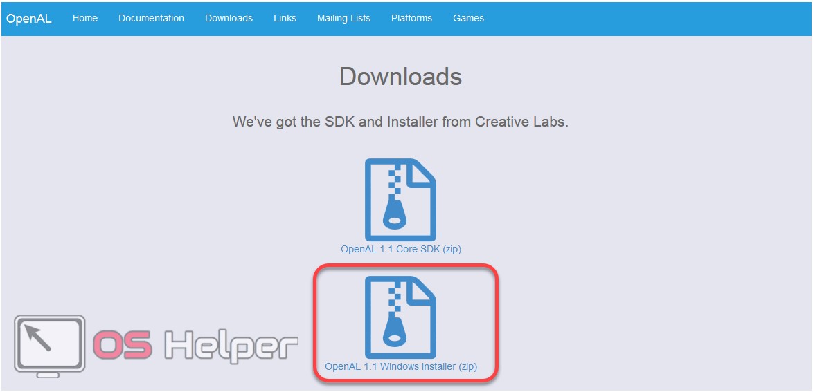 - Кликаем по прямой ссылке под названием «OpenAL 1.1 Windows Installer (zip)», чтобы загрузить установщик.