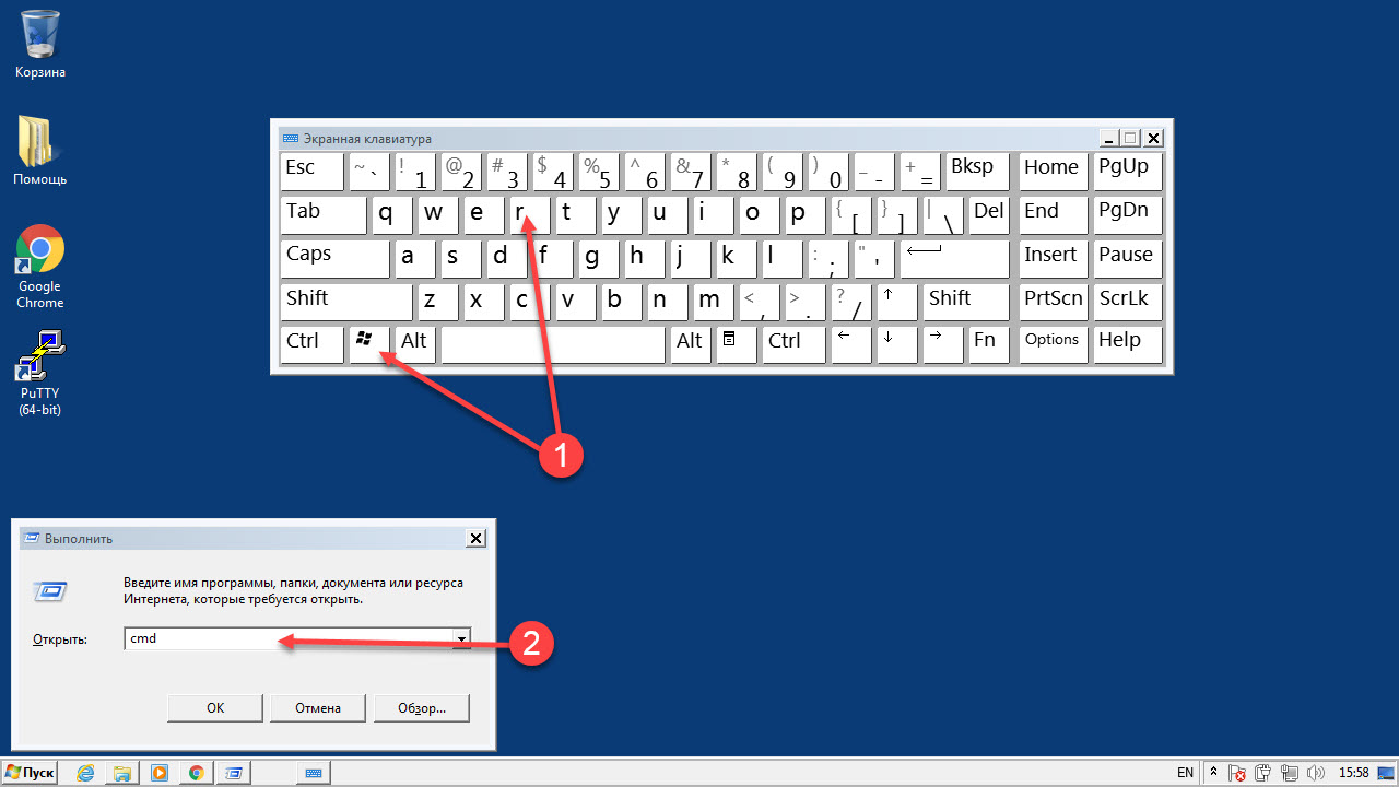 - При помощи командной строки. Для вызова командной строки надо нажать сочетание кнопок R и Win. В появившемся окне следует ввести «cmd.exe». После этого откроется командная строка, в которой надо указать «shutdown/r».