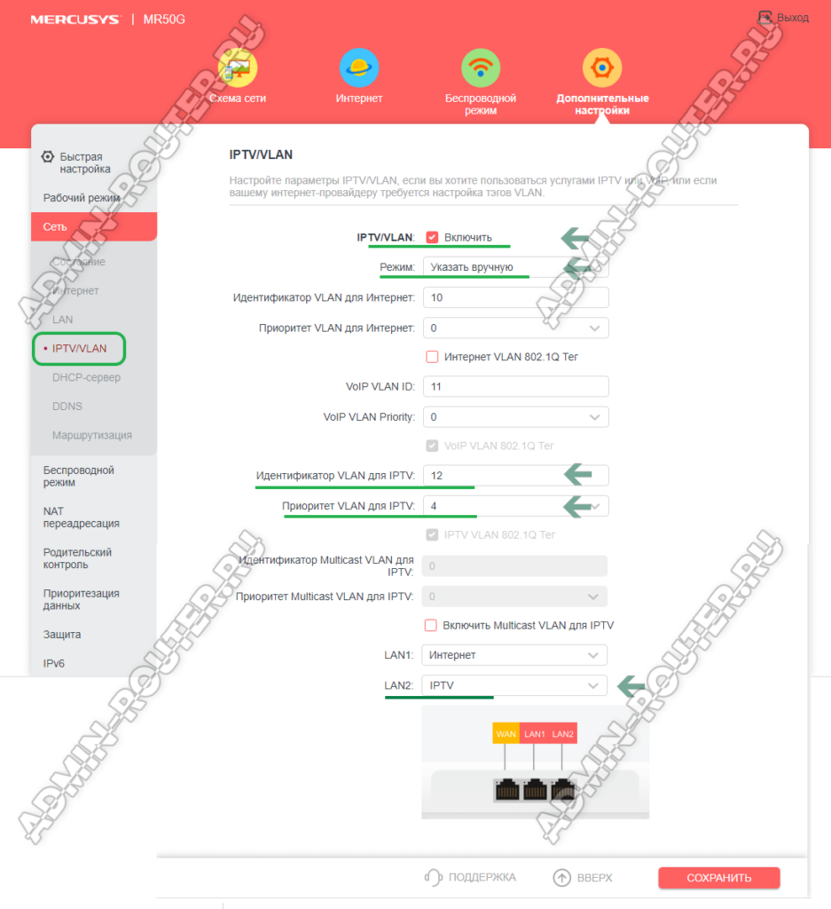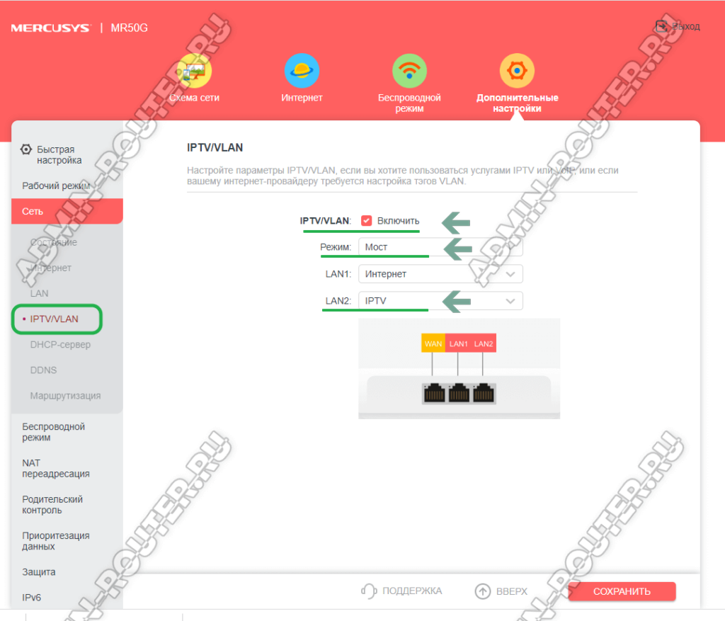 Первый вариант настройки телевидения — мост без Vlan ID. Для примера рассмотрим настройку для роутеров Mercusys (у TP-Link интерфейс аналогичен):