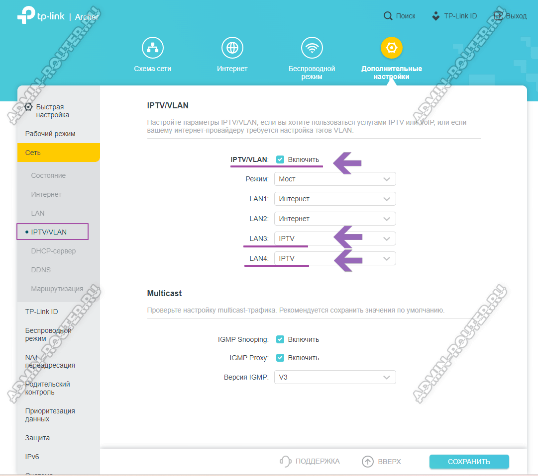 В меню панели управления роутером найдите раздел с настройками IPTV(VLAN). Откройте его и включите функцию, постав галочку «Включить». Ниже надо выбрать режим «Мост»(или же «Bridge», что одно и то же). После этого надо выбрать порт на роутере, в который включите ТВ-приставку и поставить ему значение «IPTV».