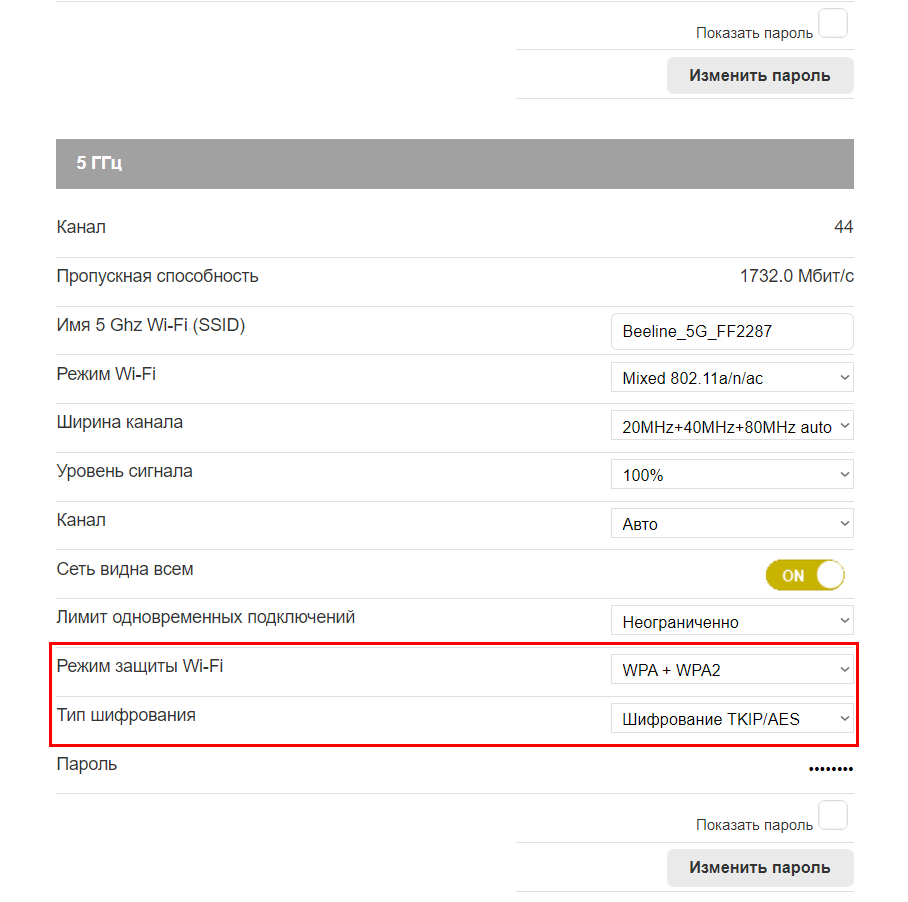 К устаревшему стандарту принято относить TKIP. Если у вас есть такая возможность, то лучше сменить его на более новый, а именно на AES. Оба пункта параметров можно увидеть на скриншоте ниже: