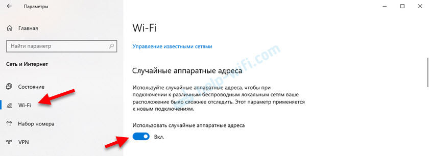 Включить ее можно в параметрах, в разделе «Сеть и Интернет» на вкладке «Wi-Fi». Возле «Использовать случайные аппаратные адреса» установите переключатель в положение Вкл.