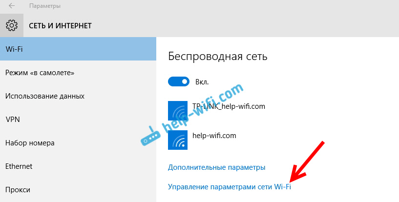 В сетевых параметрах, в разделе Wi-Fi, нажмите пункт «Управление параметрами сети Wi-Fi».