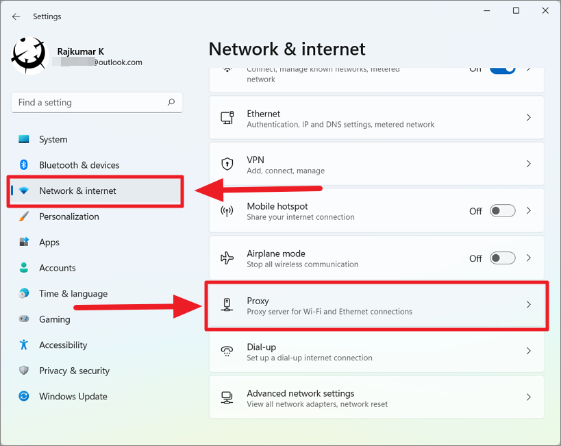 Сначала откройте настройки Windows 11, перейдите на вкладку «Сеть и Интернет» и выберите параметр «Прокси» справа.