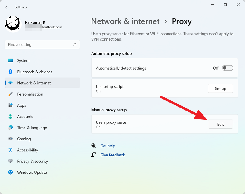 Если вы настроили собственный прокси-сервер, нажмите кнопку «Изменить» рядом с параметром «Использовать прокси-сервер».