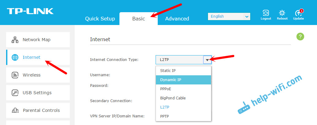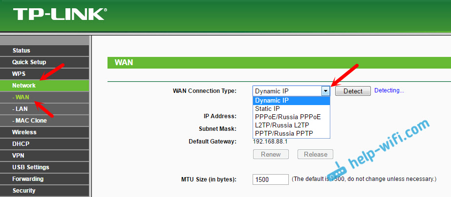 1 Первым делом нужно узнать какой тип подключения использует ваш интернет-провайдер. И если это не Динамический IP, то вы должны знать дополнительные данные (пароль, имя пользователя, адрес сервера). Так же, нужно узнать, использует ли провайдер привязку по MAC-адресу (таких провайдеров не много, но они есть). Вся необходимая информация, как правило указана в договоре по подключению к интернету.2 Если вы уже пробовали настроить роутер, то лучше сбросить настройки на заводские. Дальше заходим в настройки роутера TP-Link, и на вкладке “Network” (Сеть) – “WAN” выбираем тип подключения, и задаем необходимые параметры.