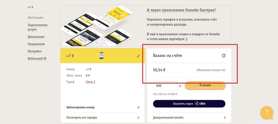 Проверка баланса через личный кабинет.