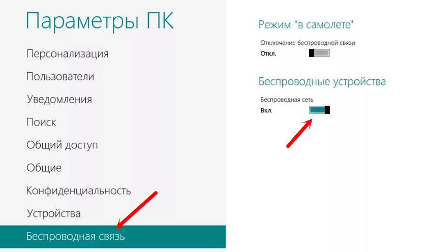 Откройте «Параметры». В разделе «Изменение параметров компьютера«, нужно выбрать вкладку «Беспроводная связь». Затем включить беспроводную сеть.