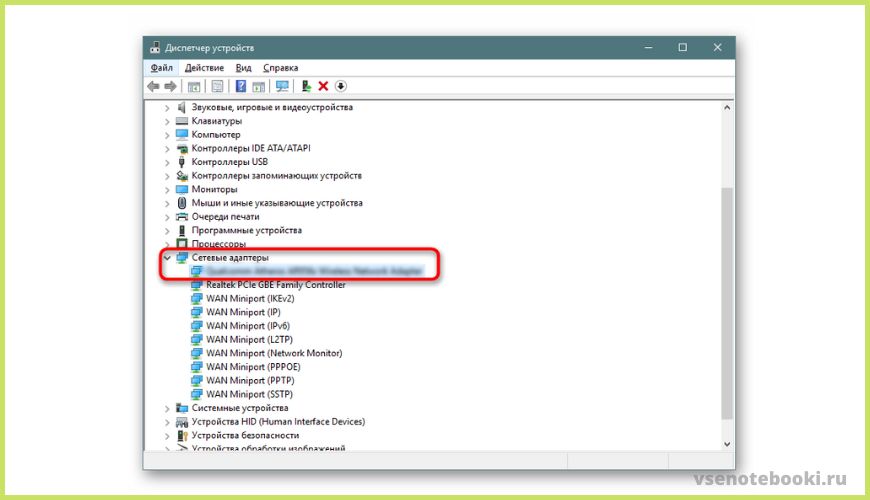 В диспетчере устройств нам нужно открыть вкладку Сетевые адаптеры, и посмотреть, есть ли там драйвер на наш беспроводной адаптер. Вы узнаете его по таким словам в названии: «Wireless» и «Wi-Fi». Вот как примерно он выглядит: