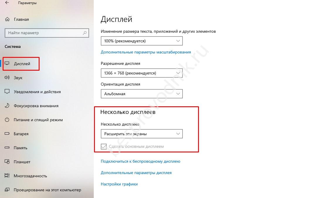 - В настройках отображения экрана на компьютере не выбран показ на несколько мониторов;