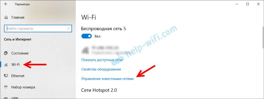 Самое простое решение, которое часто является очень эффективным – удалить/забыть Wi-Fi сеть и подключиться к ней заново. В Windows 10 нужно открыть «Параметры» и перейти в раздел «Сеть и Интернет» – «Wi-Fi». Открыть «Управление известными сетям».