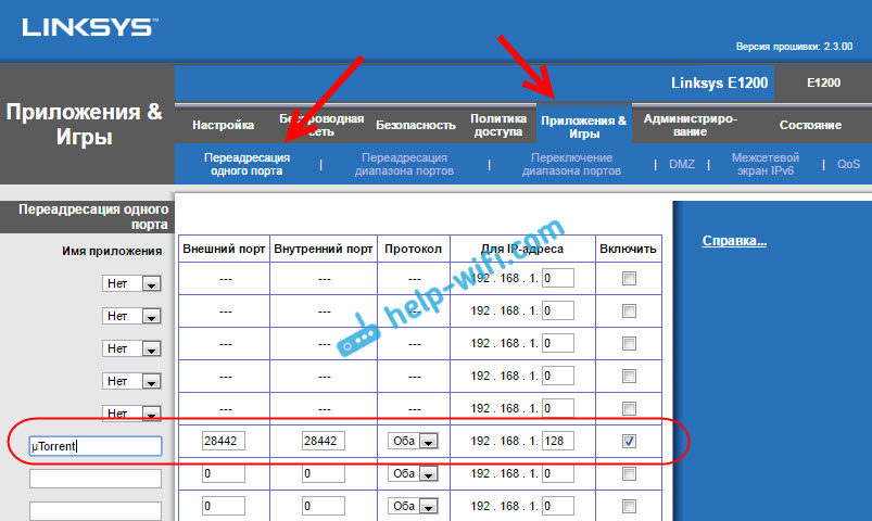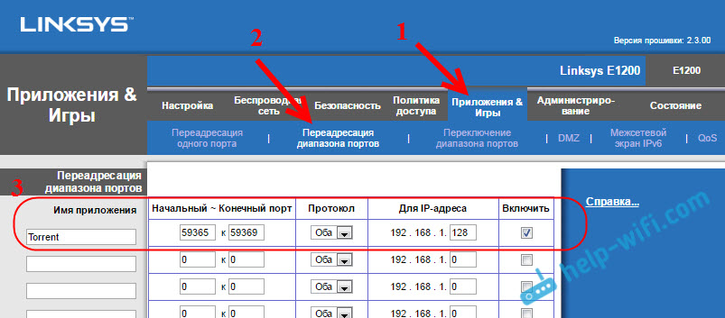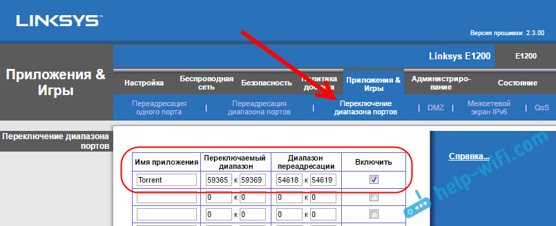 Открываем порт в настройках роутера Linksys