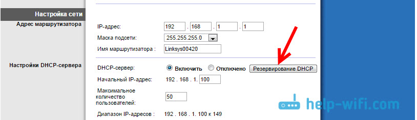 На главной странице настроек, напротив пункта «Настройки DHCP-сервера» нажмите на кнопку «Резервирование DHCP».