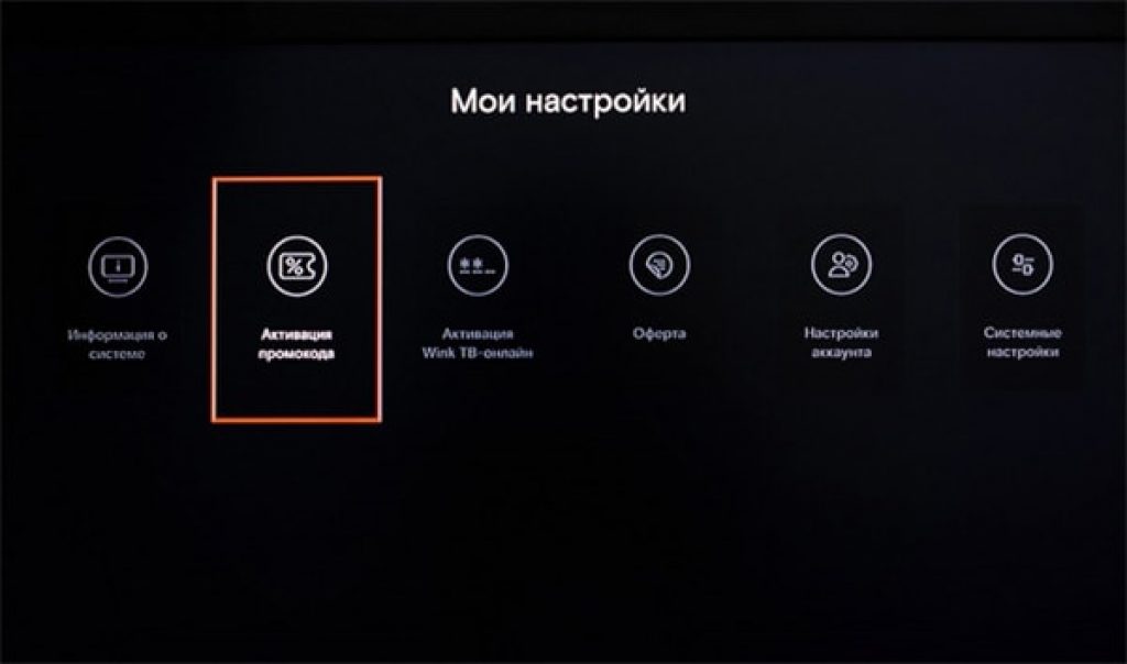 Используете Wink для телевизора – активация 7-значного кода осуществляется через настройки. Откройте меню, выберите «Мое», а затем «Настройки». Следом жмите кнопку, как показано на изображении ниже, а в появившейся строке вводите семь цифр, полученные при покупке услуг провайдера.