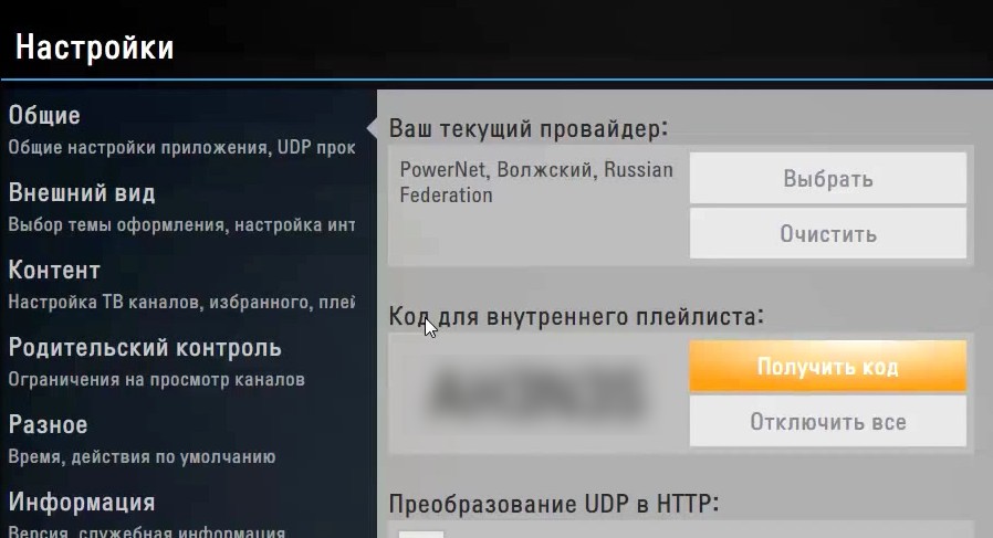 - Для загрузки внутреннего плейлиста зайдите в «Настройки», откройте подраздел «Основные» и нажмите «Получить код», после чего будет сгенерирован одноразовый пароль, его необходимо ввести при скачивании (код действителен в течение одного день с момента получения, то возможен новый запрос). Далее необходимо зайти на сайт SS IPTV в раздел «Редактор плейлистов», ввести код в соответствующую форму и нажать «Добавить устройство». Далее открываем и сохраняем документ, в результате появится плитка под названием «Мой плейлист» появится в разделе «Настройки».