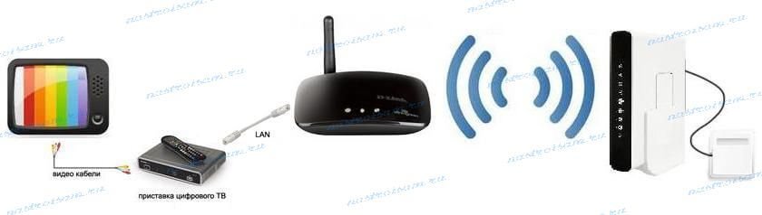 Здесь сложности могут возникнуть в том, что роутер должен уметь логически отделять Wi-Fi от LAN-портов. К тому же надо ещё подобрать такую модель Wi-Fi адаптера, который будет работать с ТВ-приставкой.
