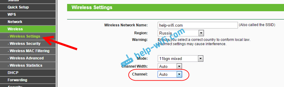 Вот для примера, смена канал на Tp-Link. Сменить его можно настройках, на вкладке Wireless (Беспроводной режим). Попробуйте поставить статический канал (только не ставьте 12 и 13), или установите Auto.