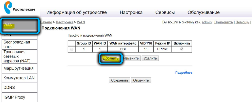 Для стандартной настройки на примере Ростелекома нам это не нужно, поэтому входим в веб-интерфейс обычным способом, и после загрузки начальной страницы переходим во вкладку WAN.