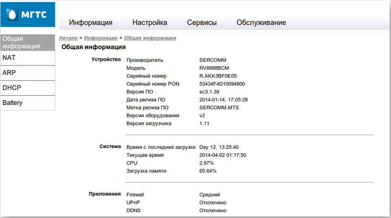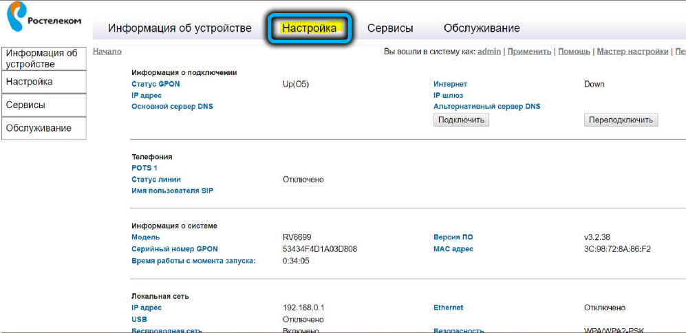Настройку SERCOMM RV6699 можно осуществлять после подключения роутера к оптоволоконному кабелю от провайдера. Рассмотрим, как зайти в веб-интерфейс роутера. В случае Ростелекома используется стандартный локальный адрес 192.168.0.1, но у МГТС IP-адрес по умолчанию 192.168.1.254, что выделяет его среди всех других домашних роутеров. Впрочем, это не принципиально, поскольку эти данные, как и логин/пароль для входа в административную панель, указываются на этикетке устройства, и их можно, а в случае пароля и нужно изменить.
