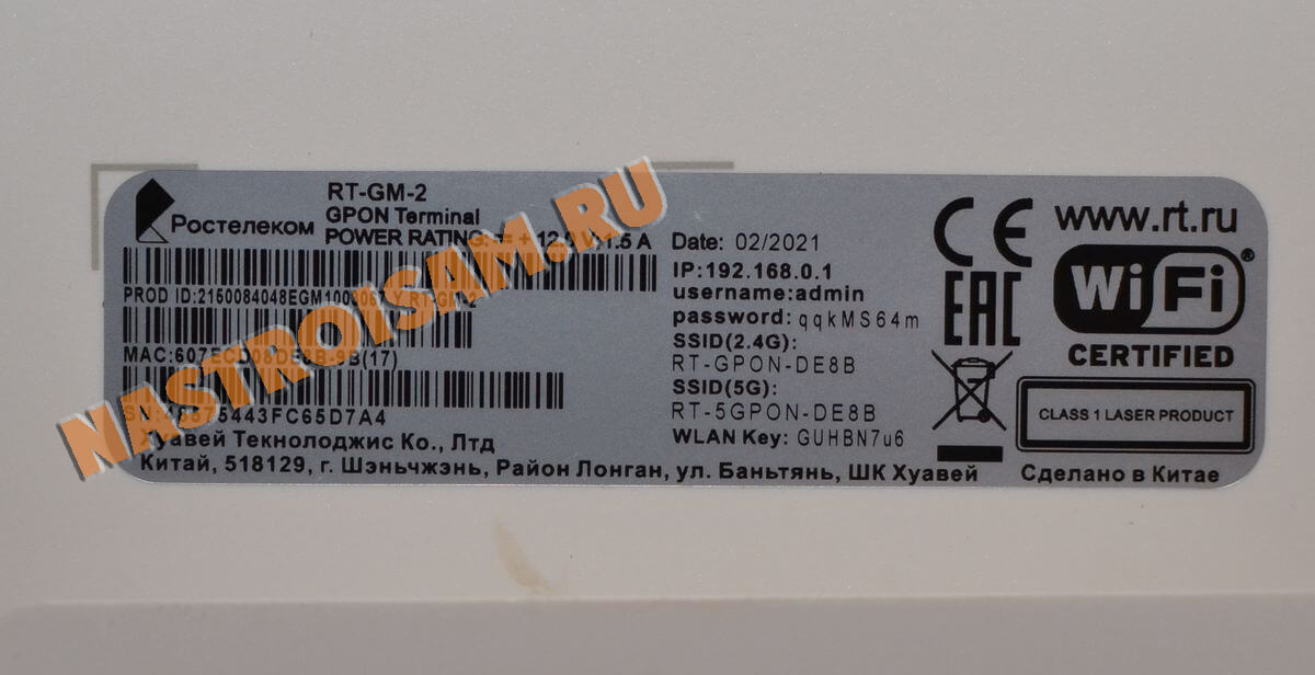 Чтобы настроить ONT-терминал Ростелеком RT-GM-2, Вам надо подключиться к его локальной сети через LAN-порт или WiFi-сеть. Локальный IP-адрес роутера — 192.168.0.1 — написан в стикере, приклеенном на нижней части его корпуса.