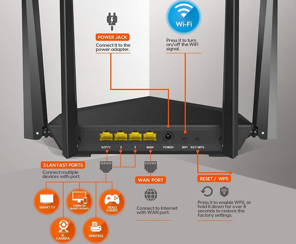 Несмотря на солидную беспроводную составляющую, роутер Tenda AC23 не обделен и кабельными возможностями. В арсенале 3 сетевых порта LAN, один из которых можно назначить для работы с IPTV приставкой. И один вход WAN для провода от интернет-провайдера.