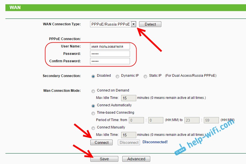 Если у вас Динамический IP, то можете сразу сохранить настройки, и интернет через маршрутизатор должен заработать. А если PPPoE, и т. д., то нужно задать необходимые параметры. Как правило, это имя пользователя и пароль. Может быть еще IP адрес. И сохраните настройки нажав на кнопку Save (Сохранить).