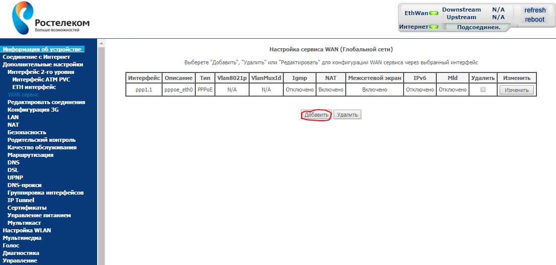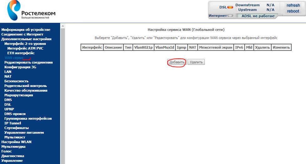 — в окне WAN выберите WAN0 и нажмите кнопку «Добавить»;
