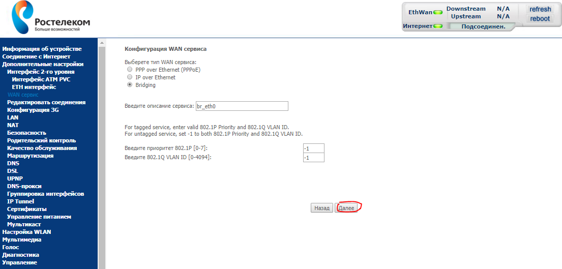 - В разделе «Сеть» — «WAN» выберите «Тип интерфейса» «Bridge». VLAN переключите в режим «Включено». Установите приоритет 802.1p в значение «4». В качестве VLAN ID укажите идентификатор виртуальной сети для IPTV. В моем случае это «50» в вашем случае VLAN может отличаться. Уточните его в технической поддержке РТ.