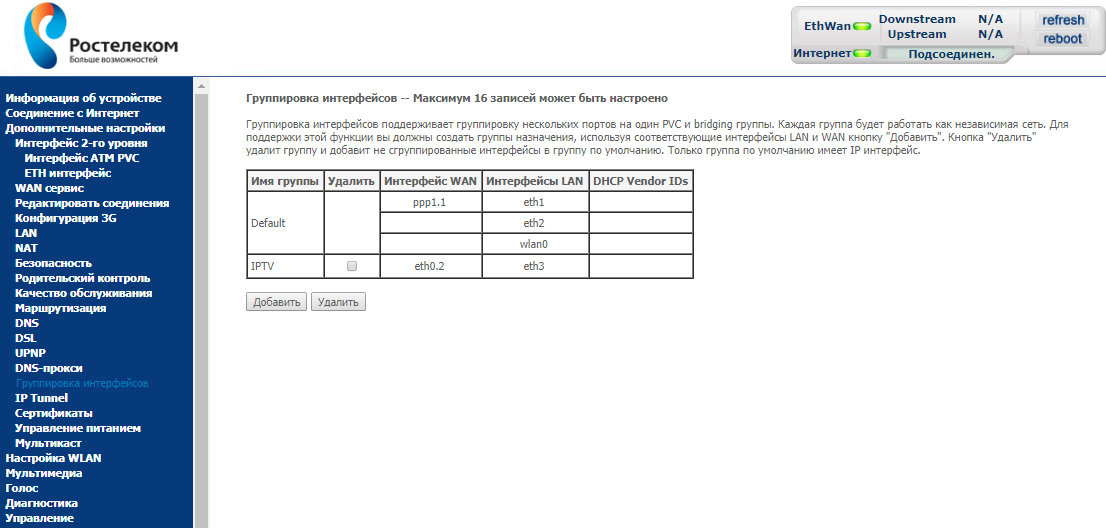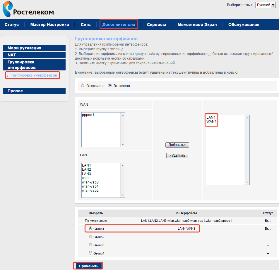 После успешного подключения настраиваем “Группировку интерфейсов”, переходим “Дополнительно” -> “Группировка интерфейсов”