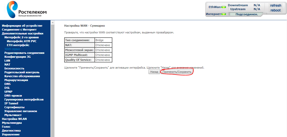 Операционная система устройства самостоятельно обновляется и перезагружается. По окончании процесса проверяются настройки и подключается кабель провайдера в разъем WAN.